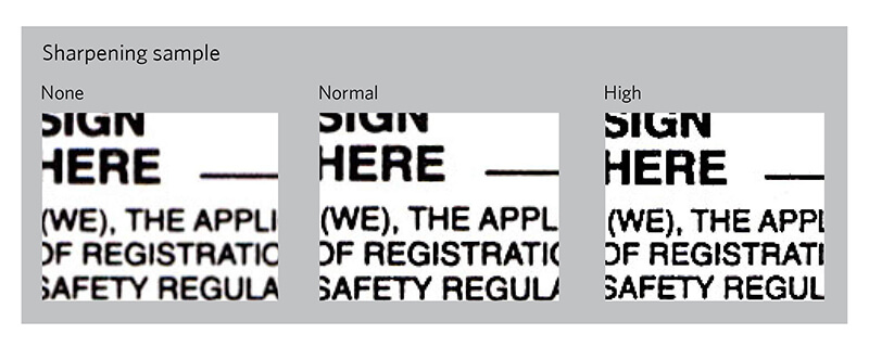 Nitidez: aumentando o contraste dos contornos em uma imagem, a nitidez automática deixa os objetos na imagem mais vivos. Isso aprimora a aparência do documento melhorando as taxas de leitura OCR.